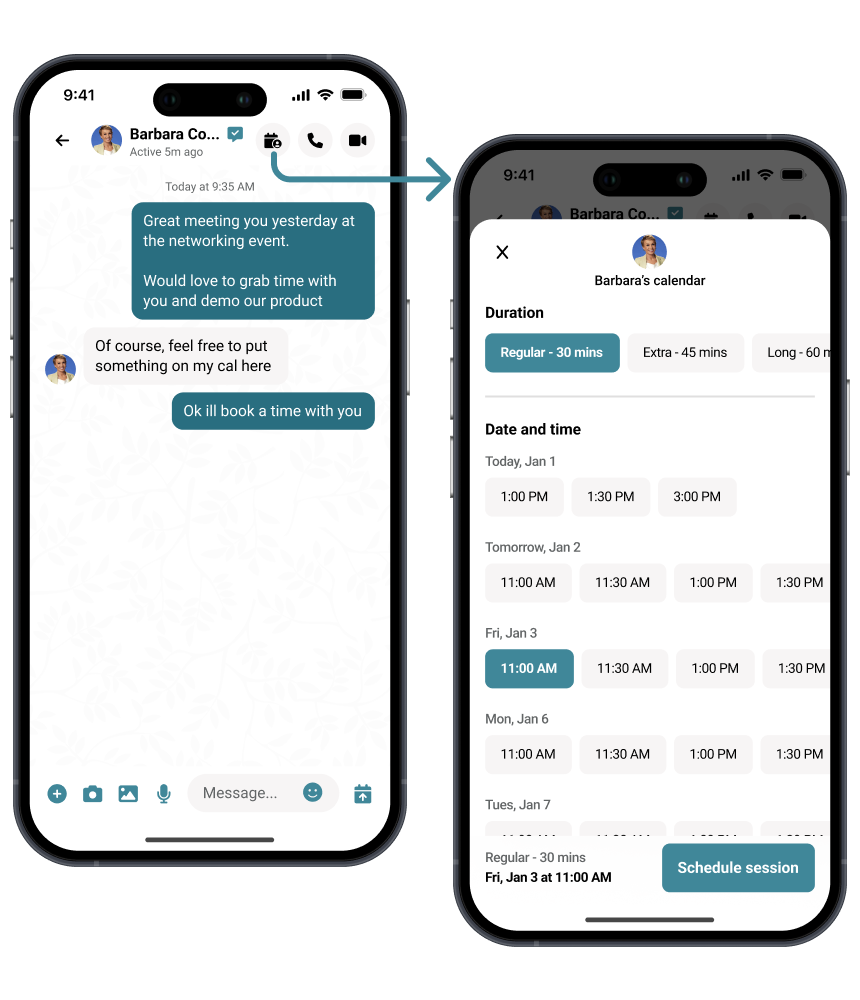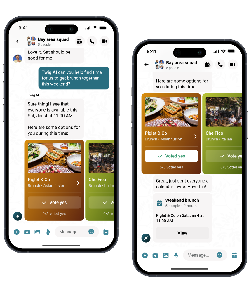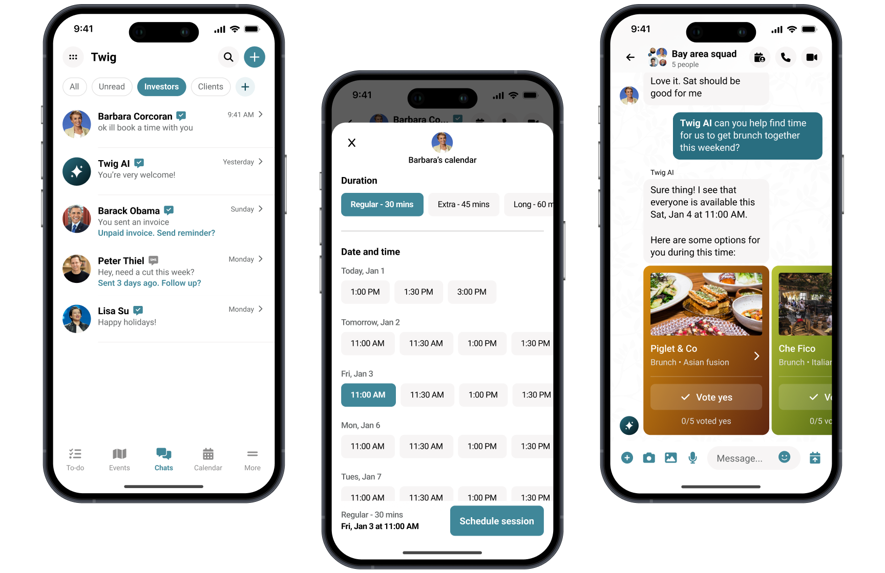 Twig makes scheduling in your chat as easy as texting itself. No links, no stress, no back-and-forth.