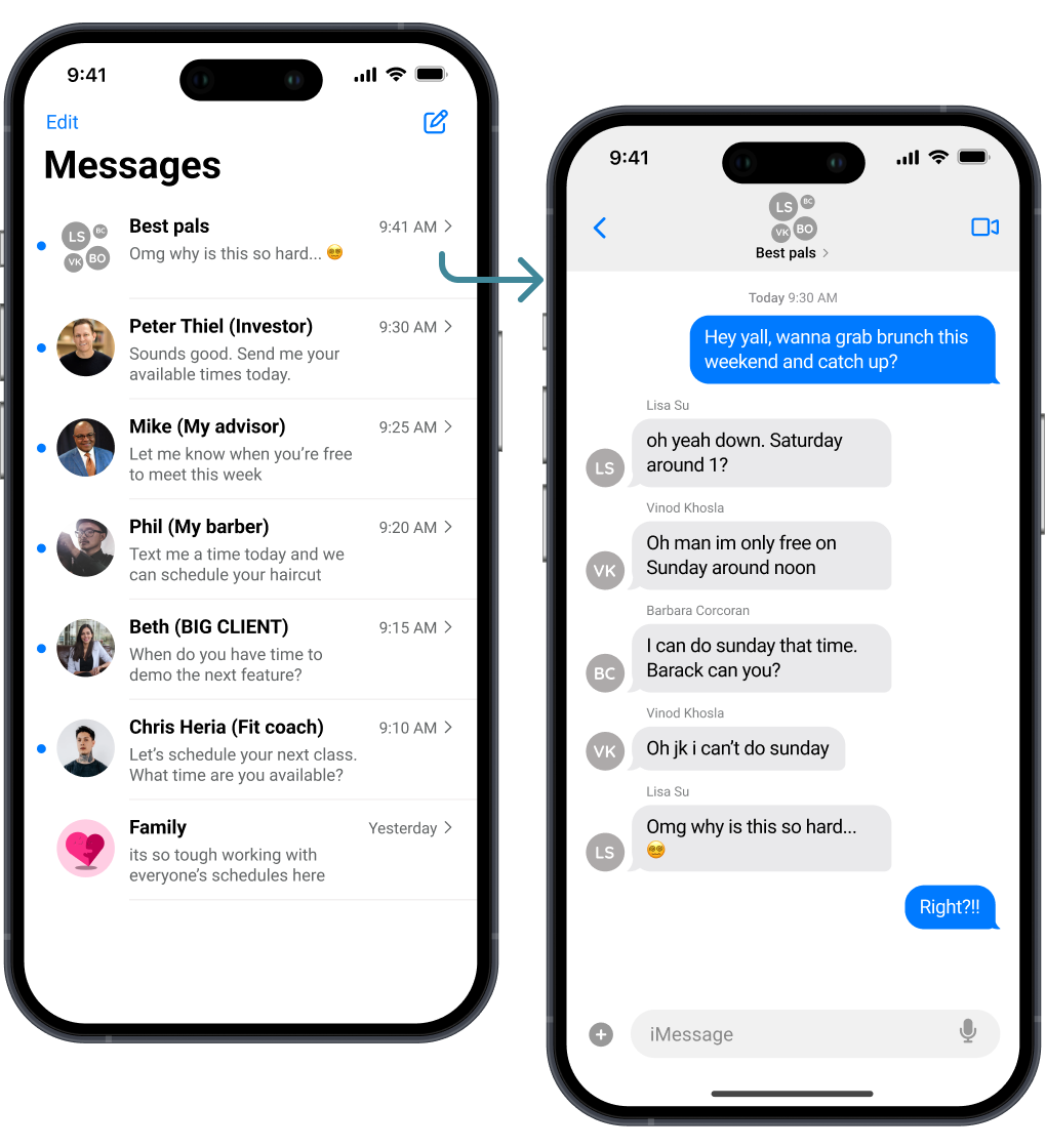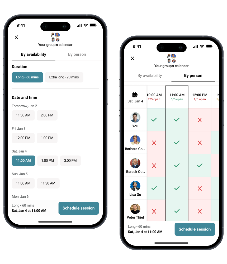 See your group’s shared availability by "time" or by "person", so you can coordinate faster, without the chaos. It’s a smarter Calendly and an easier Doodle, all directly in your chat.